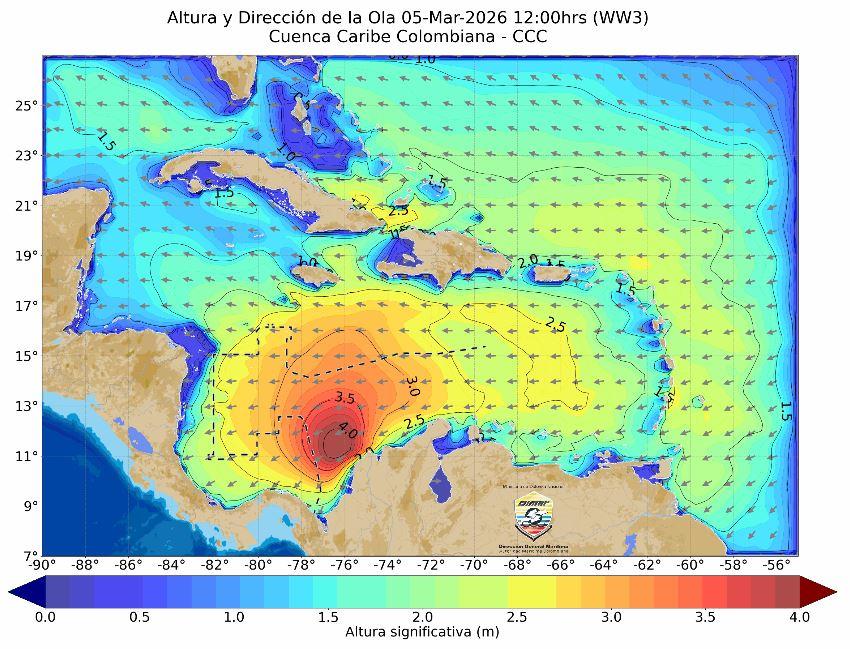 Las condiciones más persistentes se esperan entre el 4 y 5 de marzo, con extensión hasta el 8 de marzo. Podría generarse mar de fondo en el litoral sur del Caribe colombiano, incluyendo Urabá antioqueño, Córdoba, Sucre y sectores de Bolívar. Aunque las condiciones más severas se presentarán en aguas abiertas, en zonas costeras se prevé atenuación. En el litoral continental se estiman alturas de 3,0 metros en Puerto Bolívar, 2,8 metros en Barranquilla y 2,7 metros en Cartagena; en el resto del litoral sur, valores inferiores a 2,0 metros. Los vientos alcanzarán 25 nudos en el sector norte 46 km/h, 23 nudos en la zona central 43 km/h y entre 8 y 17 nudos en el sector sur 15 a 31 km/h. En el área insular se estiman 1,3 metros en Providencia y 1,1 metros en San Andrés, con velocidades de hasta 37 km/h.