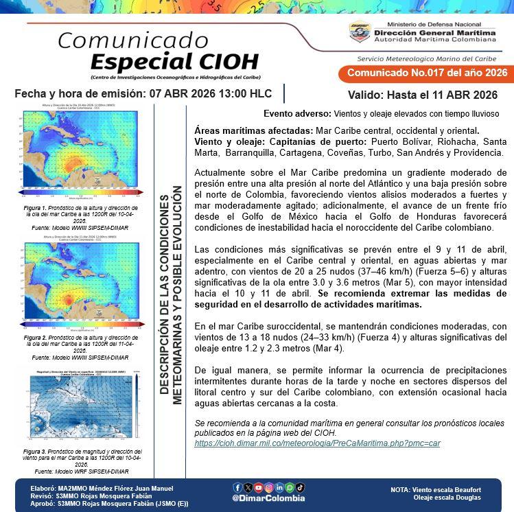 Las condiciones más significativas se prevén entre el 9 y 11 de abril, especialmente en el Caribe central y oriental, en aguas abiertas y mar adentro, con vientos de 20 a 25 nudos (37–46 km/h) (Fuerza 5–6) y alturas significativas de la ola entre 3.0 y 3.6 metros (Mar 5), con mayor intensidad hacia el 10 y 11 de abril. Se recomienda extremar las medidas de seguridad en el desarrollo de actividades marítimas.