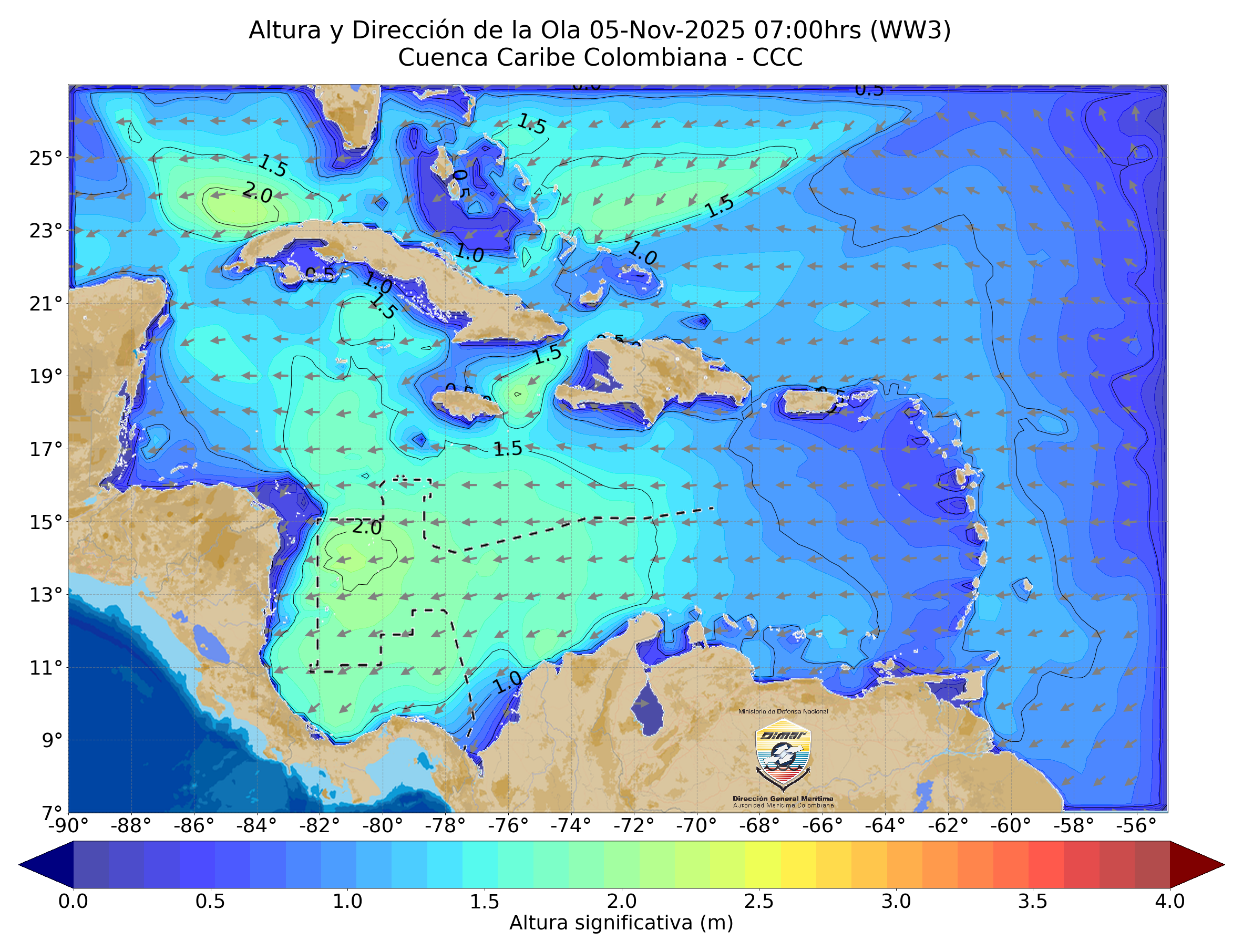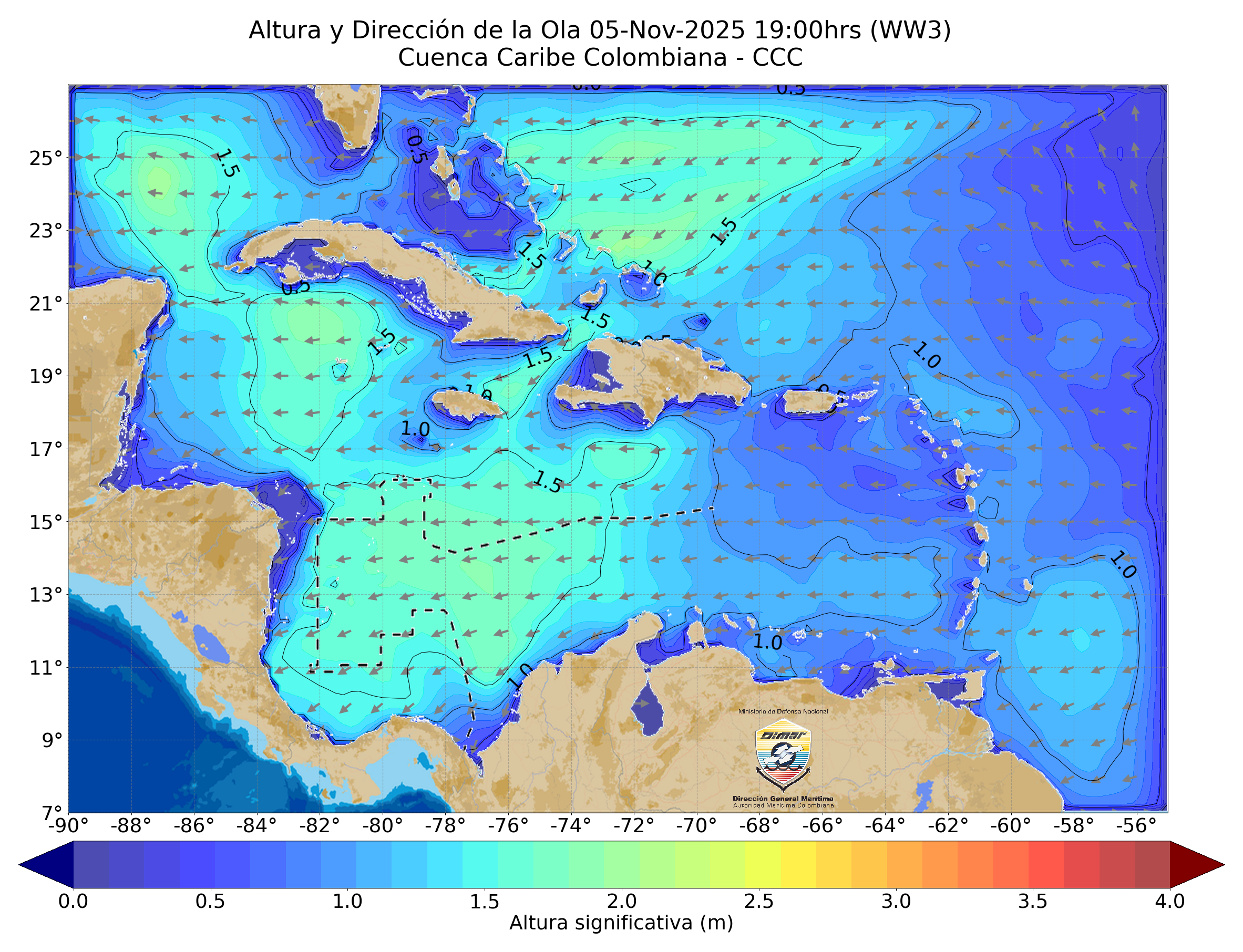 Las condiciones en el mar caribe permanecen bajo la influencia de la vaguada monzónica, la cual oscila entre los 08°n y 11°n en el suroeste de la cuenca y el tránsito de una onda tropical del este que toma lugar aproximadamente en los 85°w. Teniendo en cuenta lo anterior, estos sistemas están favoreciendo la divergencia en altura y aportando abundante humedad, lo que contribuye a la ocurrencia de lluvias dispersas y tormentas eléctricas aisladas en gran parte del caribe colombiano occidental, especialmente sobre la zona noroccidental y suroccidental, mientras que, para el caribe centro y oriental se observan condiciones más secas en asociación a la actividad de la dorsal subtropical. La interacción entre estos sistemas define vientos con dirección predominante del este-noreste con velocidades entre 14 y 23 nudos (fuerza 3-5), una altura de la ola significativa de 1.3 a 2.3 metros (mar 4-5). Se recomienda extremar las medidas de seguridad en el desarrollo de actividades marítimas.