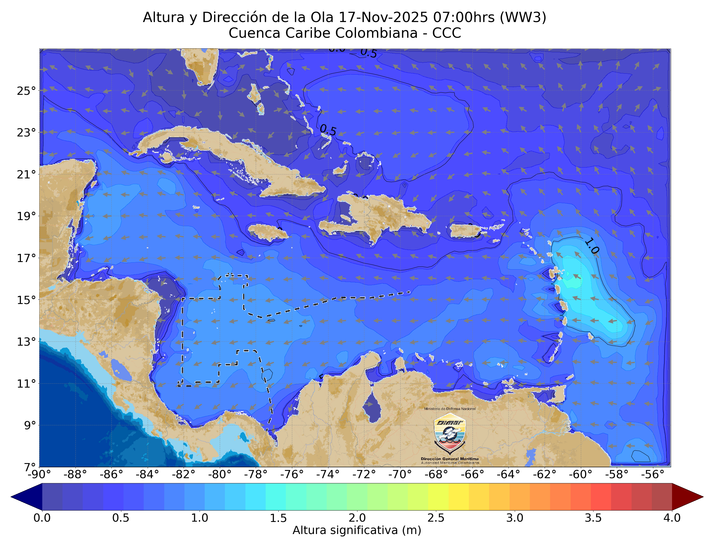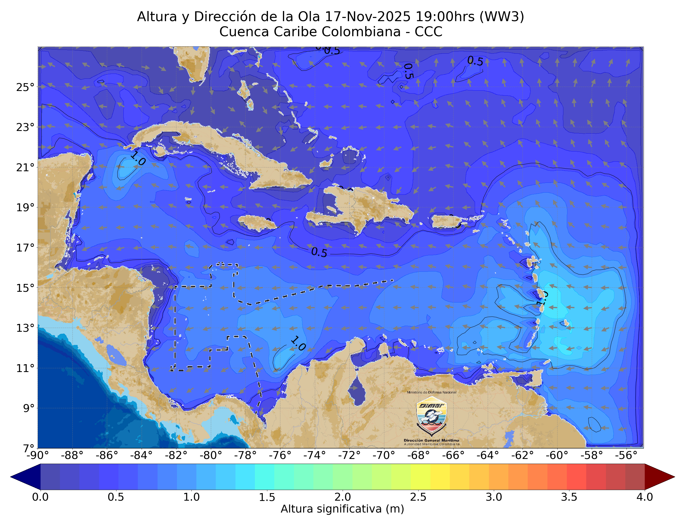 Sobre el mar Caribe se tiene la interacción entre un sistema de una baja presión (1010 mbar), ubicado sobre el centro del mar Caribe; la vaguada monzónica, que toma lugar entre los 8°N y los 10°N, afectando directamente el sur del litoral Caribe colombiano, donde se tiene un constante aumento de convección moderada; un frente frio ubicado sobre las Antillas mayores; un conjunto de sistemas de alta presión ubicado cerca de Florida (1015 mbar); al mismo tiempo se tiene la interacción de estos sistemas antes mencionados con la dorsal que está situada en el centro del Atlántico Norte Tropical (1020 mbar). La constante interacción entre estos sistemas favorece de manera directa el desarrollo de vientos alisios de dirección predominante este y noreste, con velocidades entre 10 y 20 nudos (fuerza 3-5), y una altura de ola significativa de 1,0 a 2,0 metros (mar 3-4). Para la bahía interna de Cartagena se esperan condiciones de cielo parcial a mayormente nublado. lluvias dispersas y tormentas eléctricas aisladas. No se descartan lluvias y/o tormentas localmente intensas acompañadas de fuertes ráfagas de viento. Vientos de dirección variable, con velocidad de 6 a 12 nudos (Fuerza 2-4). Altura significativa de la ola oscilará entre 0.9 a 1.1 metros (Mar 3). Se recomienda extremar las medidas de seguridad en el desarrollo de actividades marítimas.