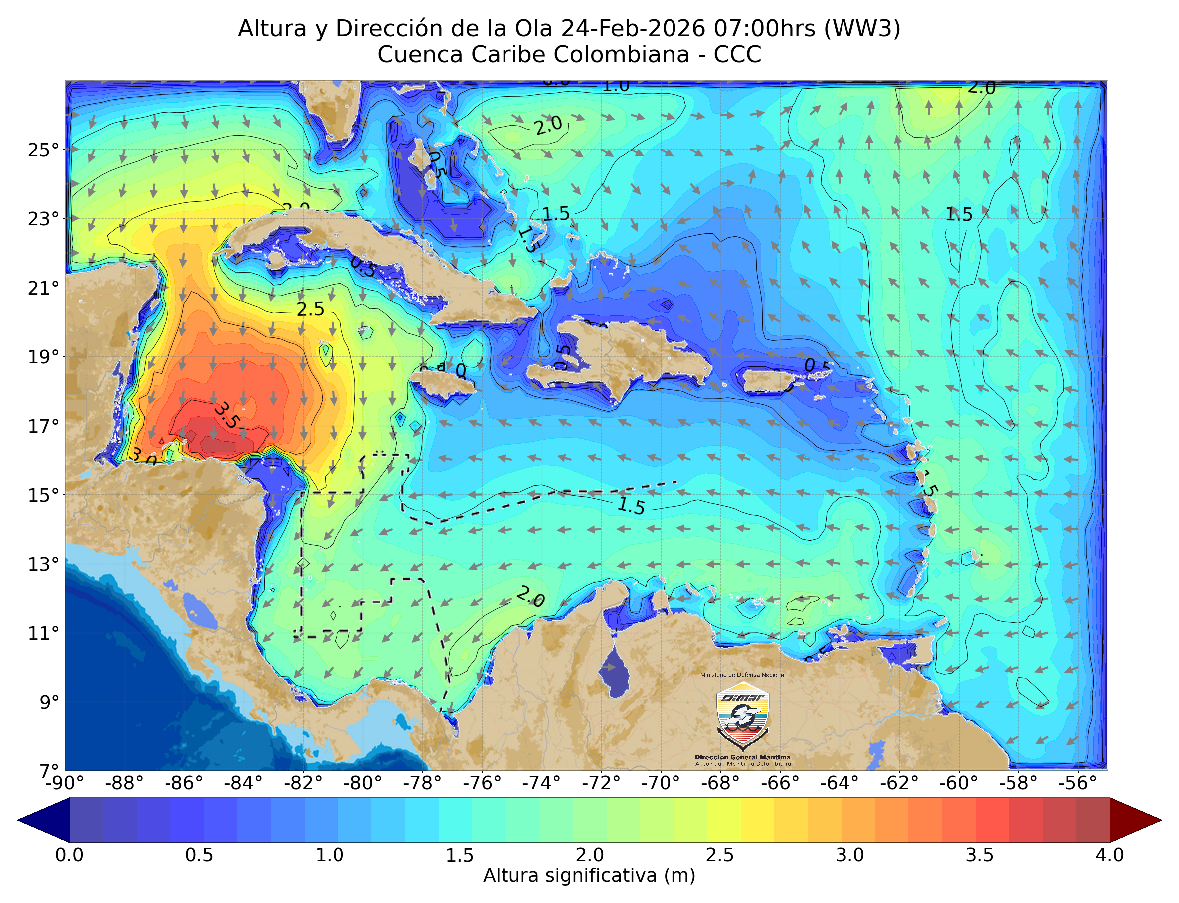 En el centro del mar Caribe se presentan los vientos más intensos, con velocidades entre 23 y 25 nudos y rachas de hasta 27 nudos, predominando del noreste. Estas condiciones generan un aumento en el estado del mar, con picos de altura significativa de la ola entre 3.5 y 3.8 metros en sectores del centro de la cuenca. En el norte del Caribe los vientos son del este-noreste entre 21 y 23 nudos, manteniendo un gradiente de presión que favorece condiciones de mar agitado.
