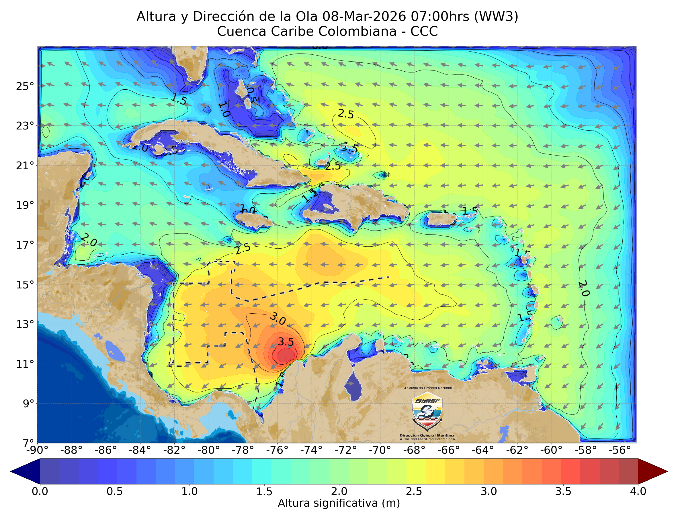 Este sistema de baja presión (1008 mbar) previamente mencionado se encuentra acoplado con la baja presión anclada al centro del litoral Caribe colombiano, lugar donde de igual forma se posiciona una alerta de viento temporal, esto quiero decir que se tiene presencia de vientos con altas velocidades las cuales oscilan entre los 25 y 30 nudos (Fuerza 6-7), con una dirección predominante este y noreste, así mismo, una altura significativa de la ola entre 2,5 y 3,2 metros. De igual forma, al occidente del Mar Caribe, los vientos oscilan entre los 18 y 24 nudos (Fuerza 5-6) y la altura significativa de la ola oscila entre 2.2 y 3.0 metros (Mar 4-5). Se recomienda extremar las medidas de seguridad en el desarrollo de actividades marítimas.