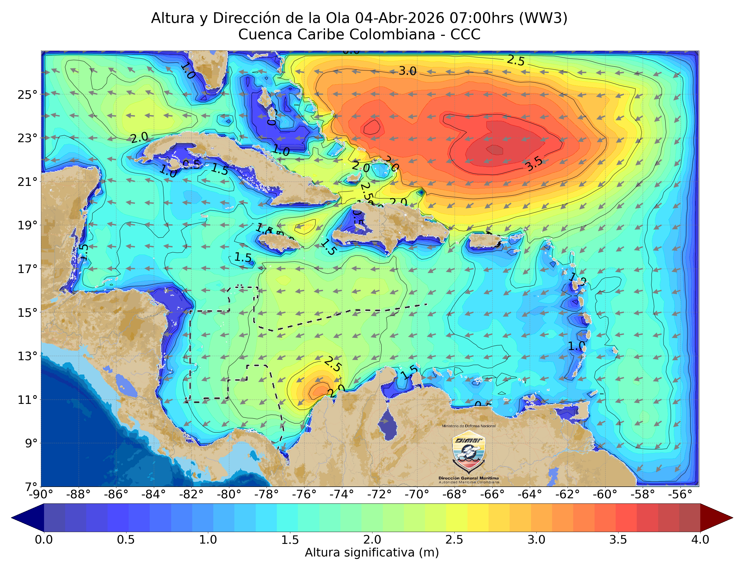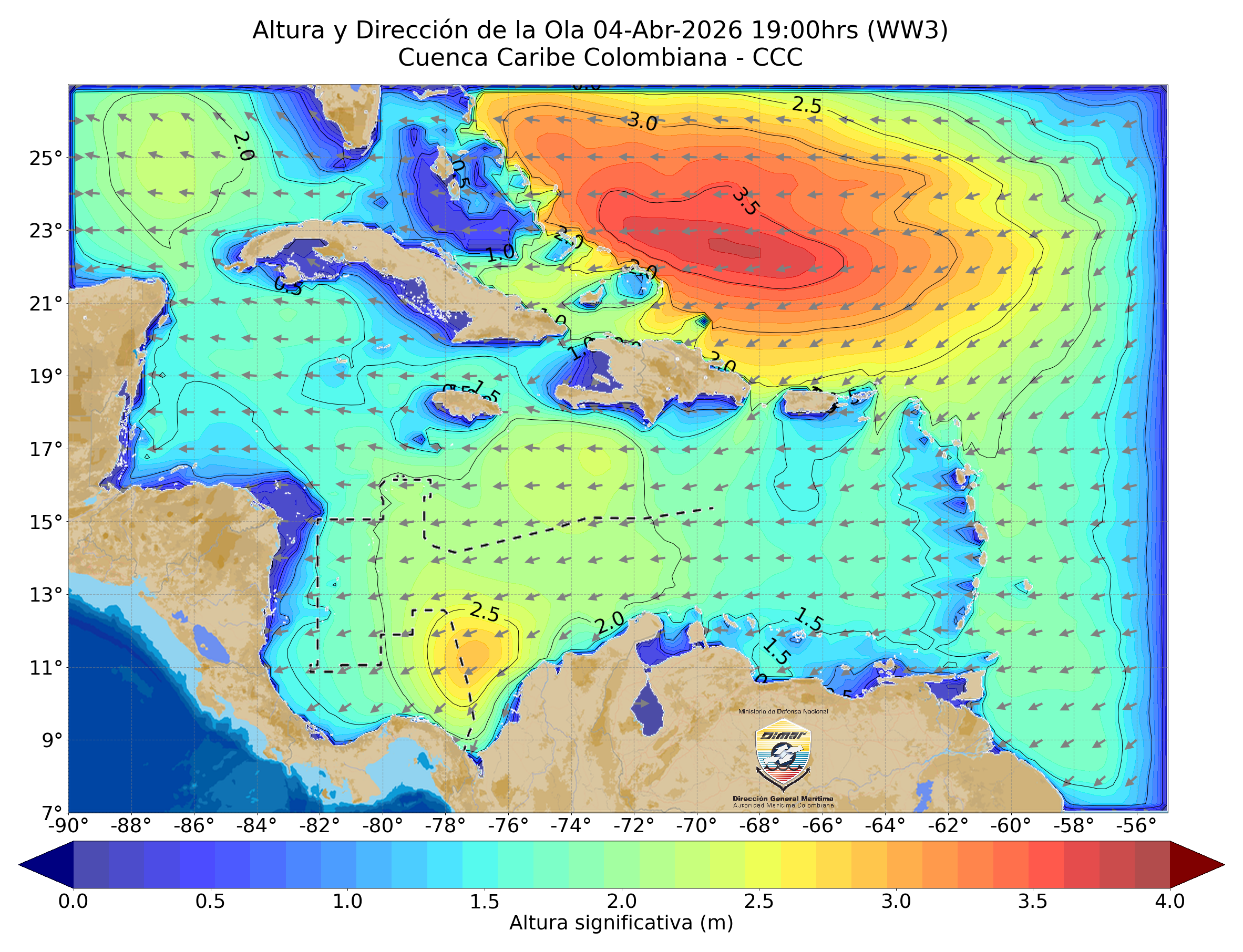 Sobre el mar Caribe, se está presentando la interacción entre un sistema de alta presión ubicado en el océano Atlántico Norte (1031 mbar) y un sistema de baja presión anclado al litoral caribe colombiano (1009 mbar), favoreciendo directamente de presión a lo largo del mar Caribe. Debido a esta configuración atmosférica predominan los vientos alisios con intensidad moderada a fuerte, especialmente en la zona centro donde se registran las mayores velocidades, vientos de dirección predominante este y noreste con velocidades que oscilan entre 20 y 25 nudos (Fuerza 5-6) y oleaje significativo entre 1,8 y 2,4 m (Mar 4).