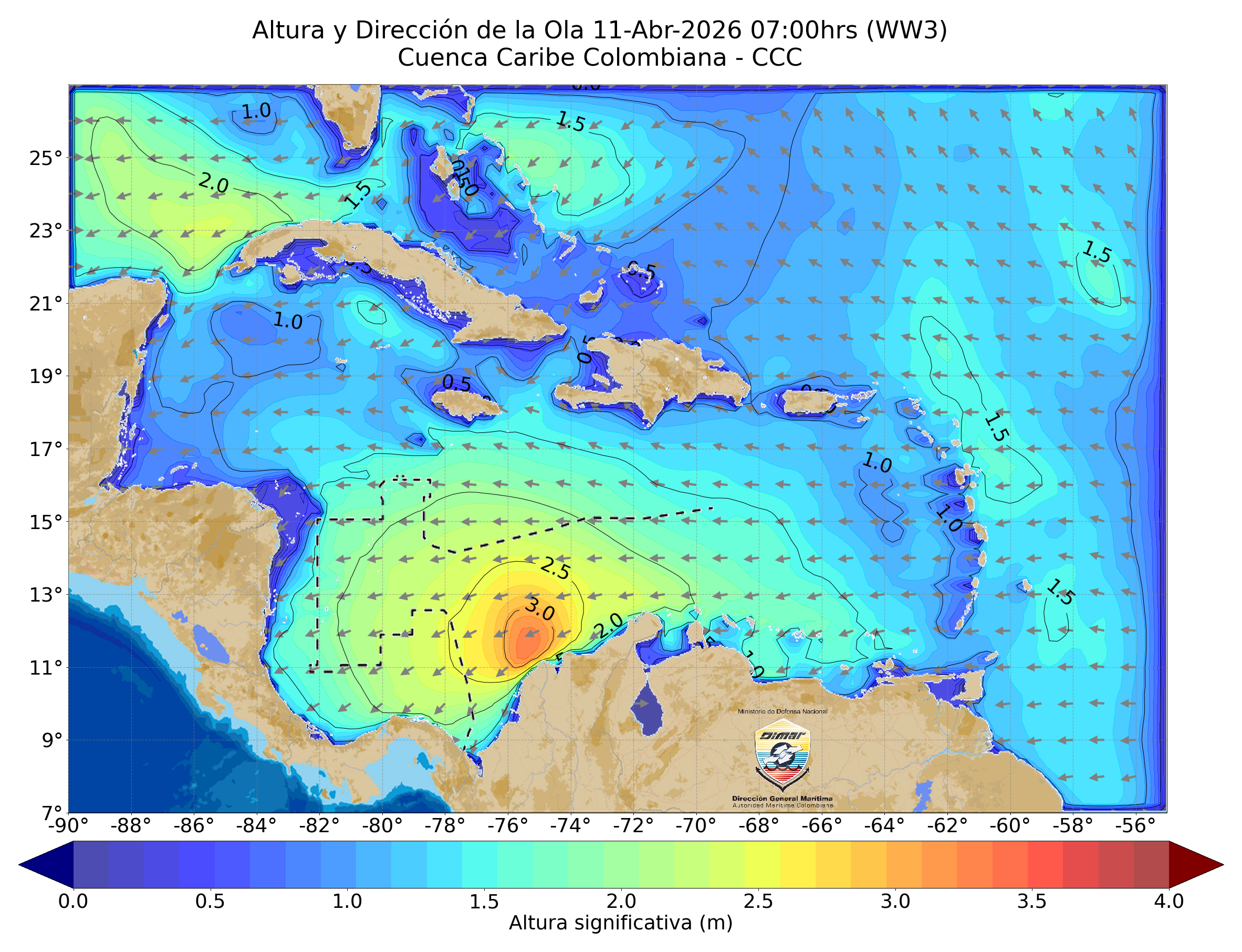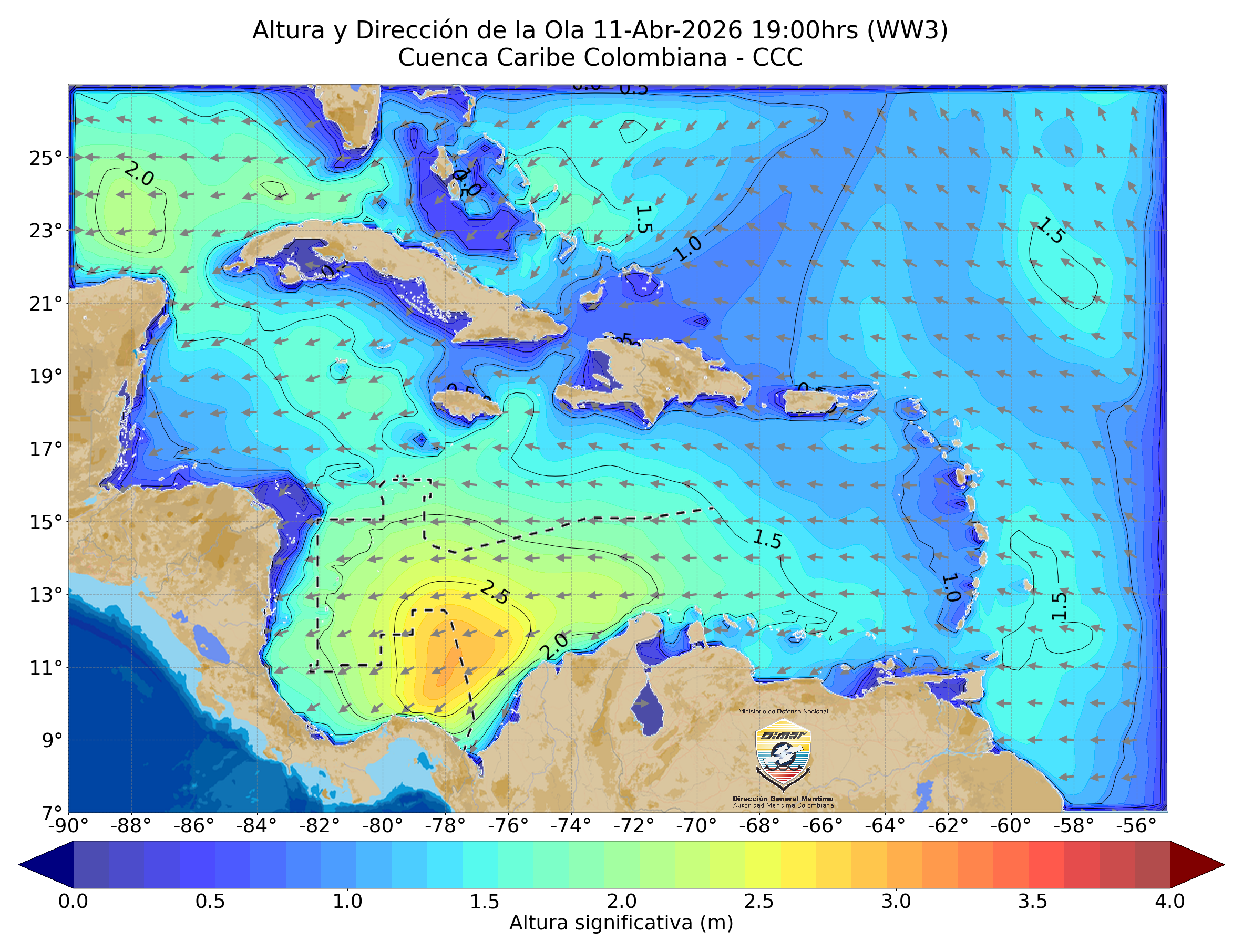 Hacia el Caribe occidental, se estiman vientos entre 9 y 16 nudos (Fuerza 3–4), que generan alturas significativas del oleaje entre 2.1 y 2.5 metros (Mar 4).
