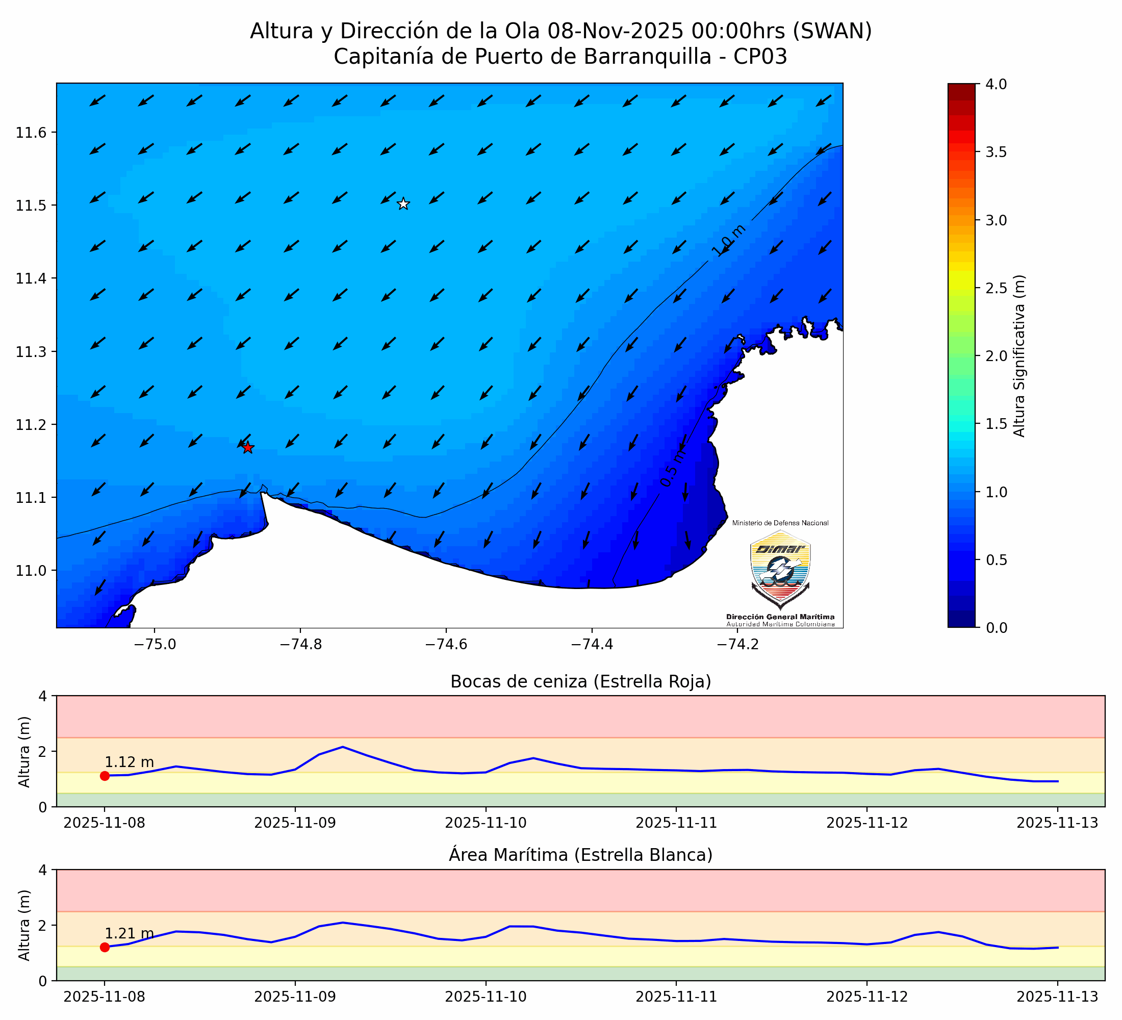 Área Marítima: Cielo mayormente despejado a parcialmente nublado. Posibles chubascos aislados. Vientos de dirección variable, con velocidades de 2 a 15 nudos (Fuerza 2-4). Altura significativa de la ola oscilará entre 0.7 a 0.8 metros (Mar 3).