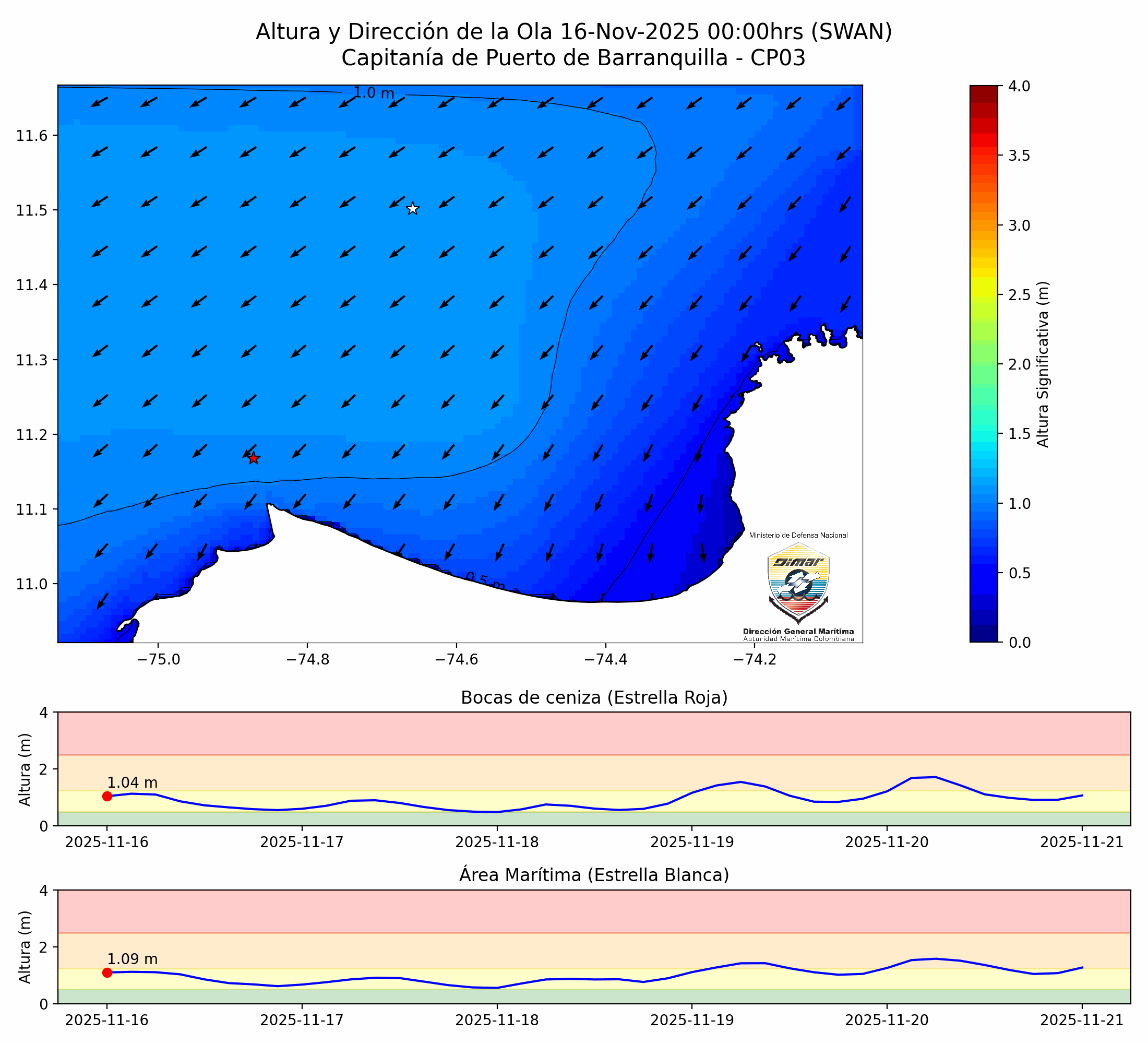 Área Marítima: Cielo mayormente nublado. Predominio de tiempo seco. Vientos de dirección variable, con velocidades de 4 a 16 nudos (Fuerza 2-4). Altura significativa de la ola oscilará entre 0.5 a 0.9 metros (Mar 3).