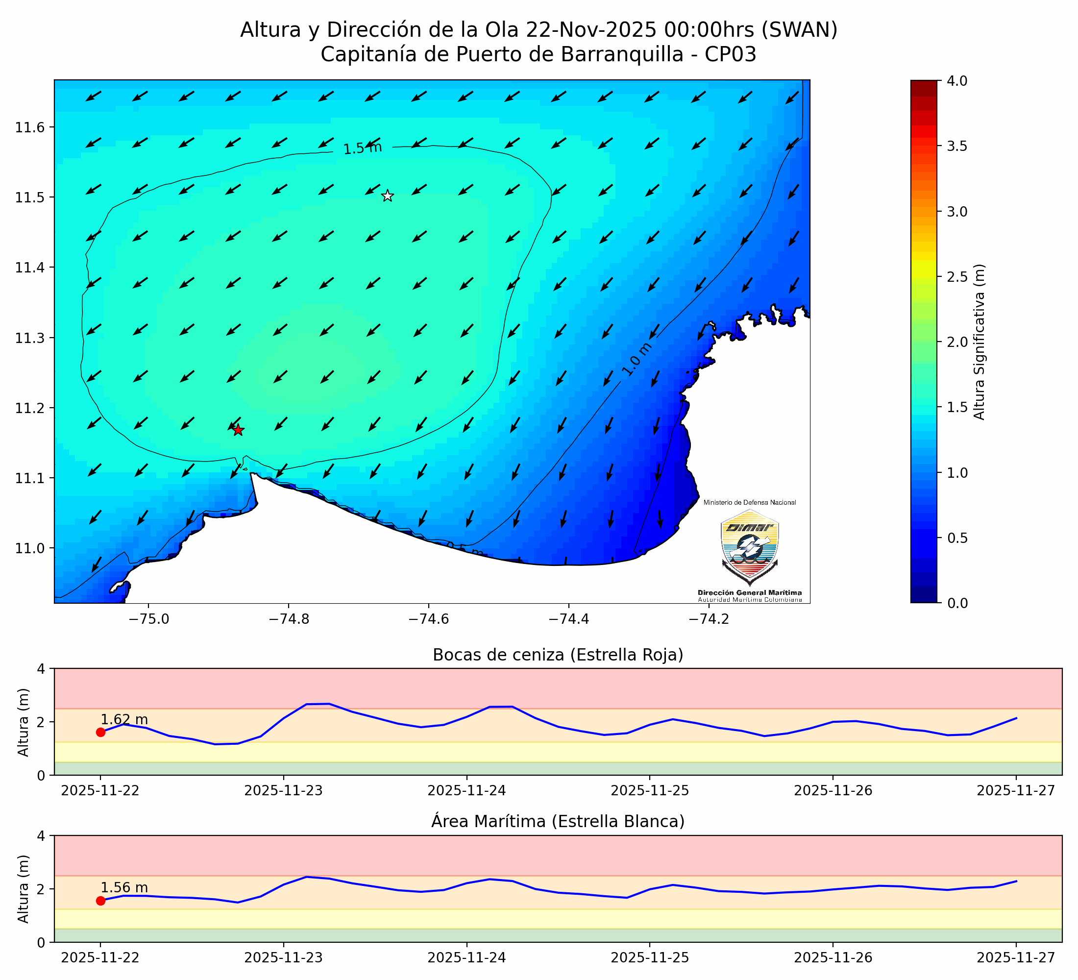 Área Marítima: Cielo mayormente despejado. Predominio de tiempo seco. Vientos de dirección variable, con velocidades de 13 a 23 nudos (Fuerza 4-6). Altura significativa de la ola oscilará entre 0.9 a 1.3 metros (Mar 3-4).
