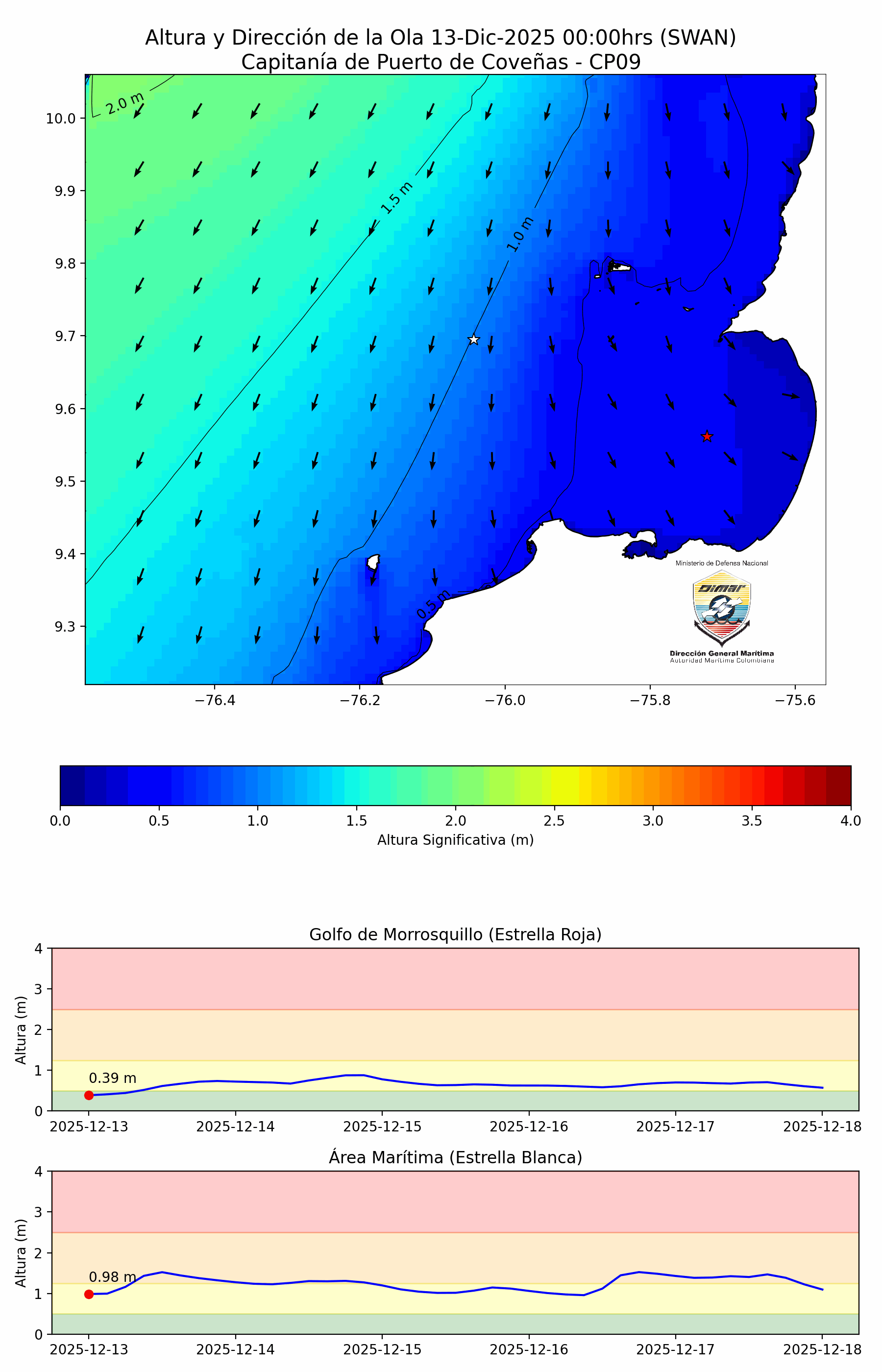 Área Marítima: Cielo parcial a mayormente nublado. Posibles lluvias dispersas de intensidad ligera a moderada. No se descarta actividad eléctrica. Vientos de dirección variable, con velocidad de 1 a 11 nudos (Fuerza 1-4). Altura significativa de la ola oscilará entre 0.4 a 0.8 metros (Mar 2-3).