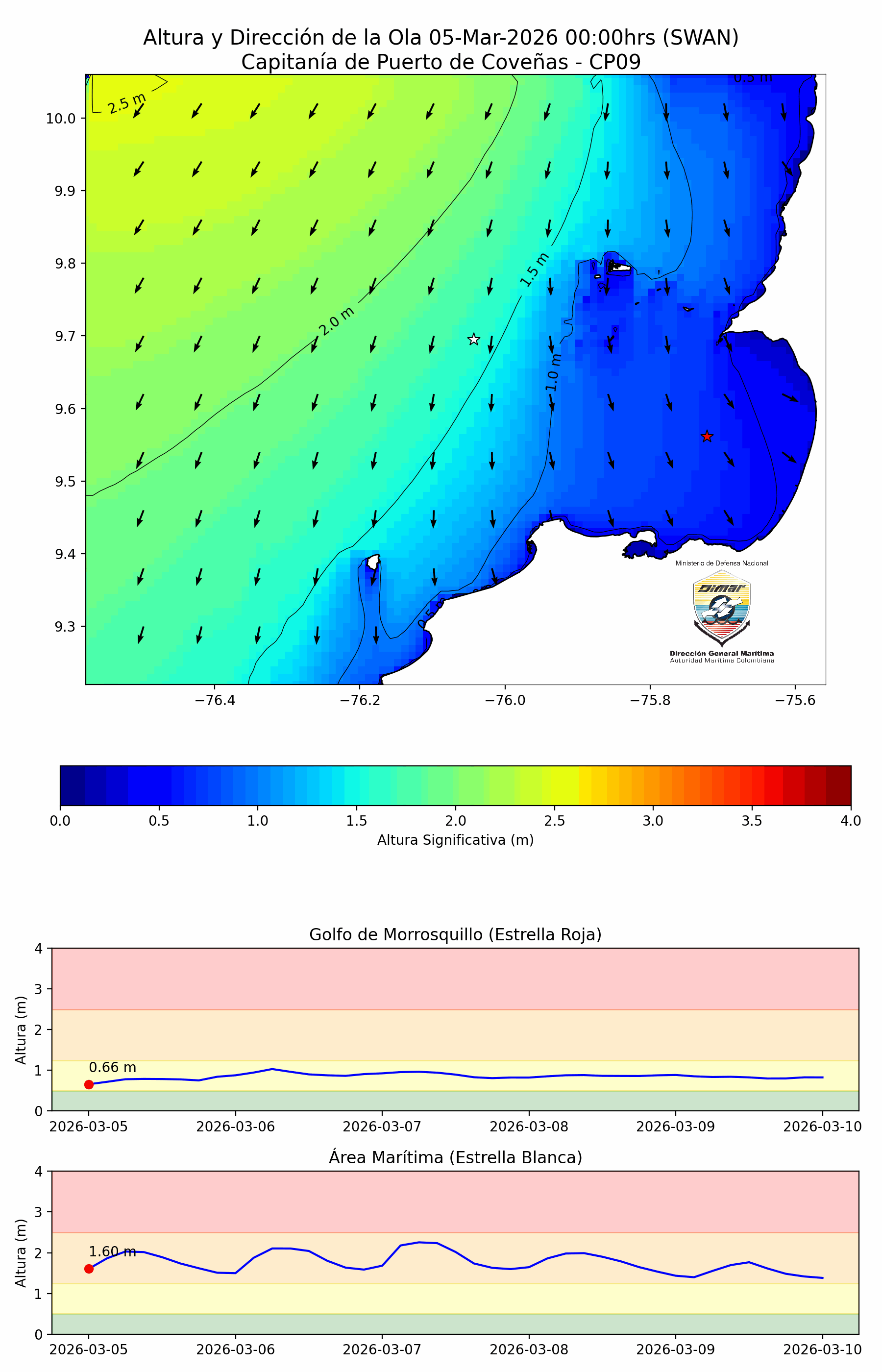 Área Marítima: Se prevé cielo parcialmente nublado con tiempo seco. Vientos de dirección nor-noreste, con velocidades de 11 a 22 nudos (Fuerza 4-6). La altura significativa de la ola oscilará entre 0.6 a 2.1 metros (Mar 3-4). Se recomienda mantener control y precaución en el desarrollo de las actividades marítimas.