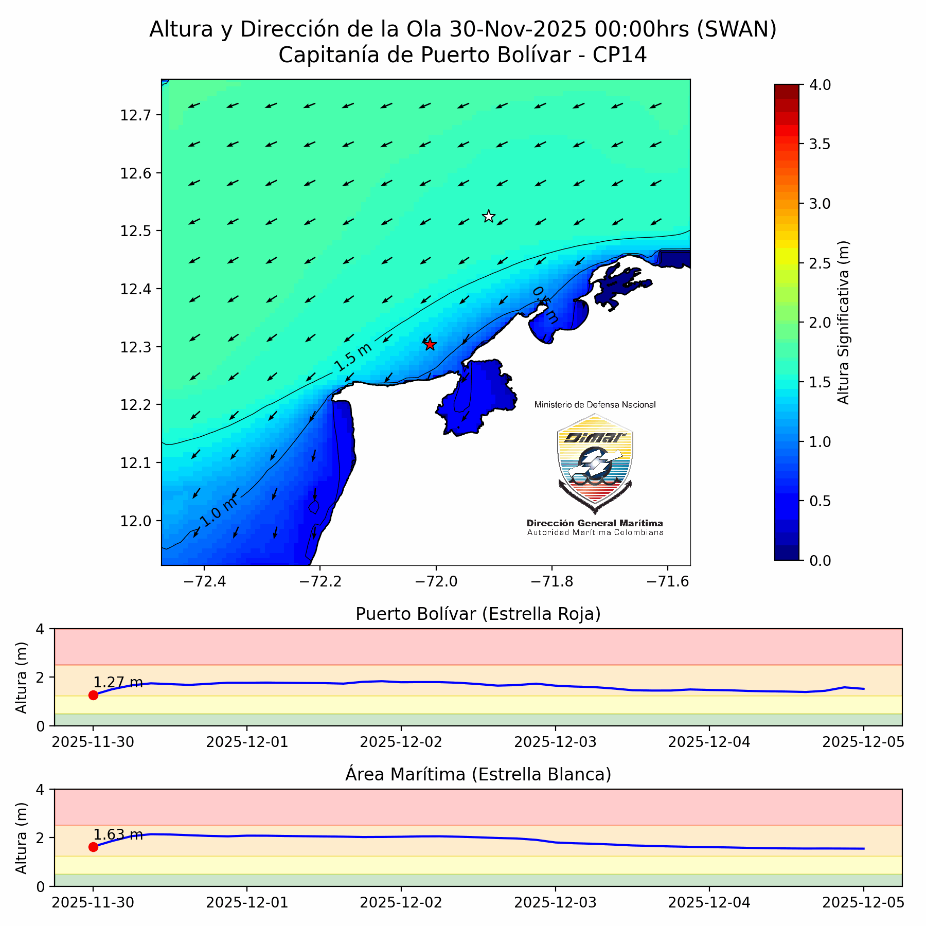 Área Marítima: Cielo despejado a parcialmente nublado. Posibles lluvias aisladas de intensidad ligera o chubascos. Vientos de dirección este-noreste a este, con velocidades de 8 a 17 nudos (Fuerza 3-5). Altura significativa de la ola oscilará 1.5 y 1.7 metros (Mar 4). Se recomienda extremar las medidas de seguridad en el desarrollo de actividades marítimas.