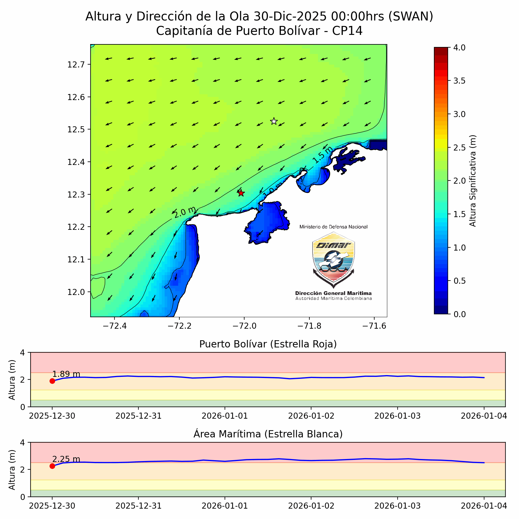 Área Marítima: Cielo mayormente despejado. Predominio de tiempo seco. Vientos de dirección este, con velocidad de 13 a 20 nudos (Fuerza 4-5). Altura significativa de la ola oscilará 2.1 y 2.5 metros (Mar 4-5). Se recomienda extremar las medidas de seguridad en el desarrollo de actividades marítimas.