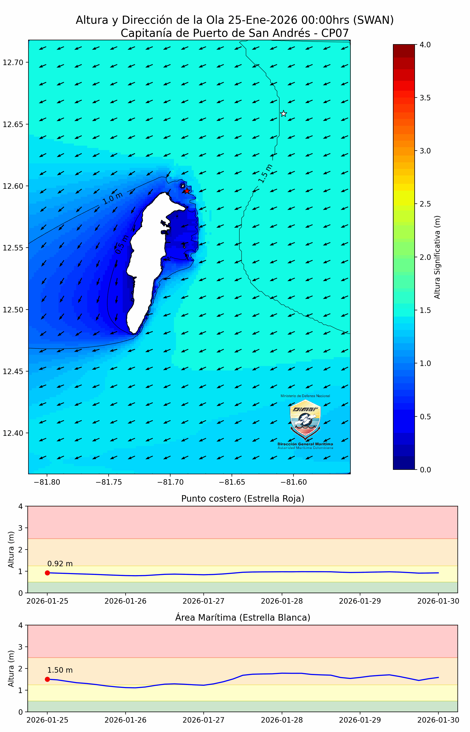 Área Marítima: Se prevé cielo muy nuboso. Posibles lluvias de intensidad ligera. Vientos de dirección noreste, con velocidades de 12 a 16 nudos (Fuerza 4). Altura de ola significativa entre 1.1 a 1.5 metros (Mar 3-4).