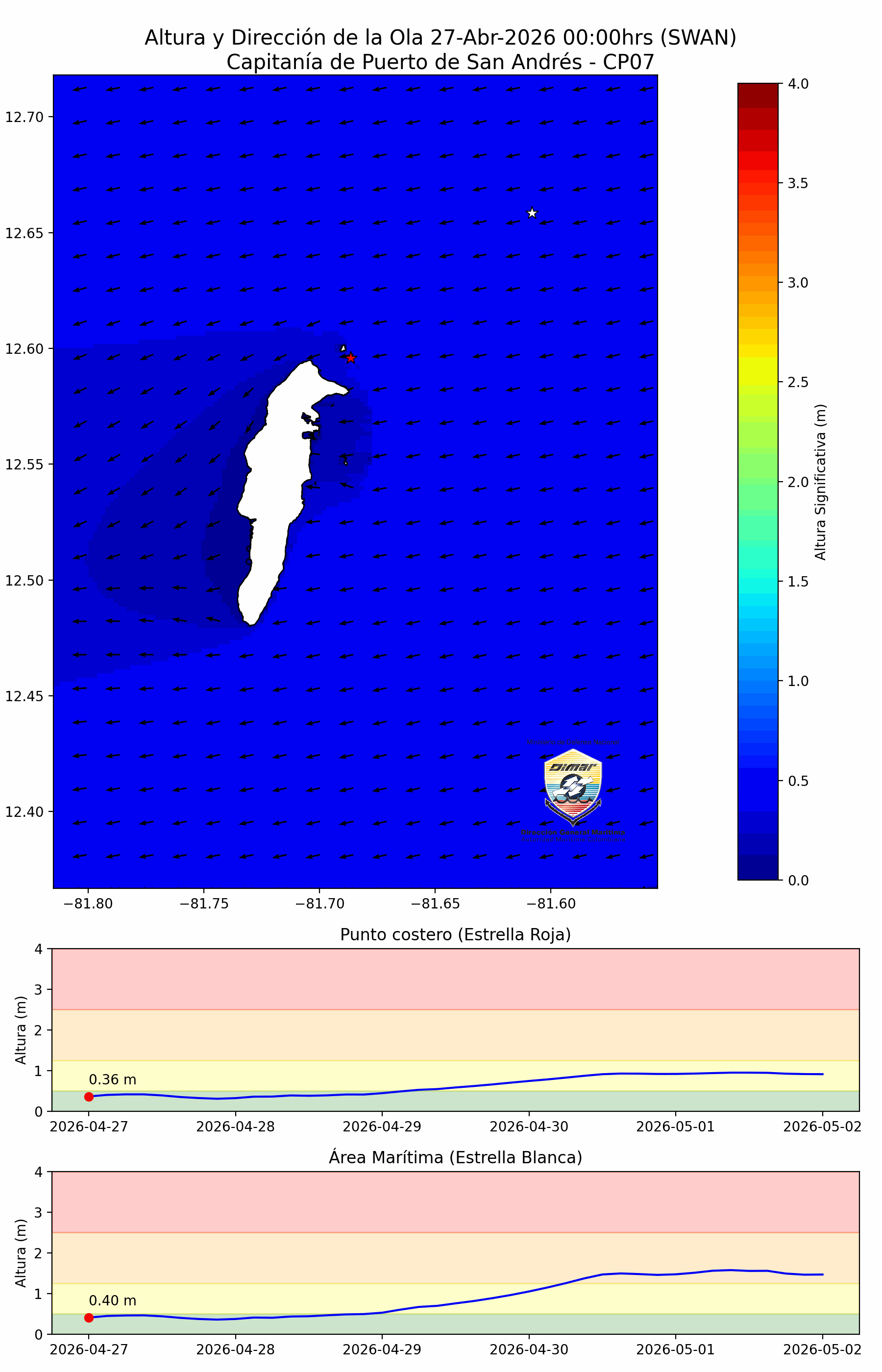 Área Marítima: Se prevé cielo despejado a nuboso. Probabilidad de lloviznas intermitentes. Vientos de dirección este, con velocidades de 9 a 13 nudos (Fuerza 3-4). Altura de ola significativa entre 0.5 a 0.7 metros (Mar 3).