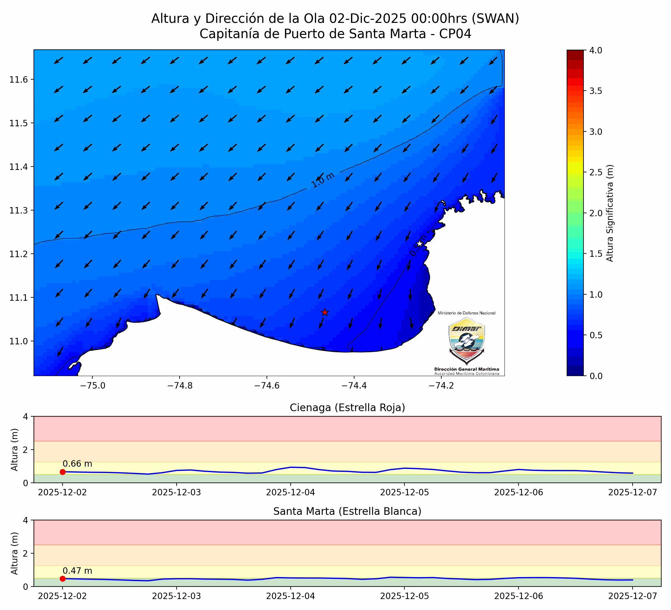 Área Marítima: Cielo mayormente despejado a parcialmente nublado. Posibles chubascos en cercanías de la costa norte. Vientos de dirección este-noreste y este, con velocidades de 10 a 20 nudos (Fuerza 3-5). Altura significativa de la ola oscilará entre 1.1 a 1.4 metros (Mar 3-4). Se recomienda extremar las medidas de seguridad en el desarrollo de actividades marítimas.